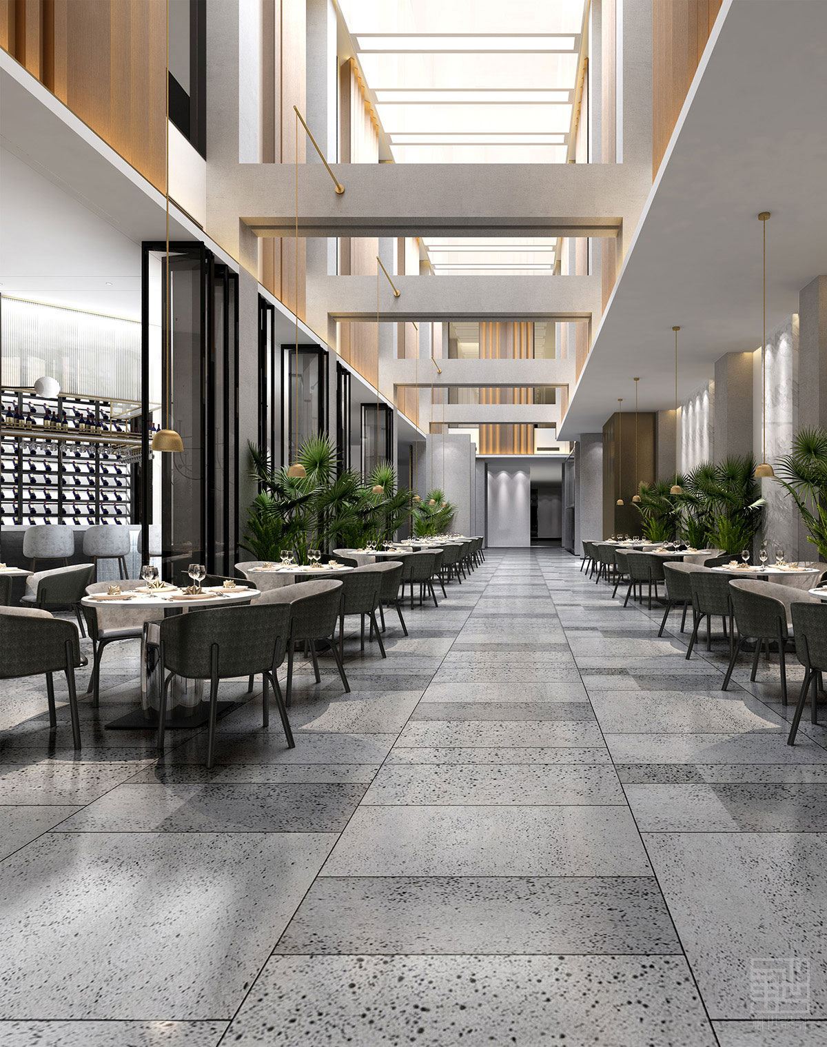 整體的設計思路十分清晰:由大量的細節(jié)共同構(gòu)成一個統(tǒng)一而完整的項目。酒店的特色之一在于構(gòu)造類似森林的共享中庭空間,掏空了一部分的體量,從而形成一個賦予了公共功能的貫通空間。貫通空間融合了交通流線元素和植被樹木等自然元素。